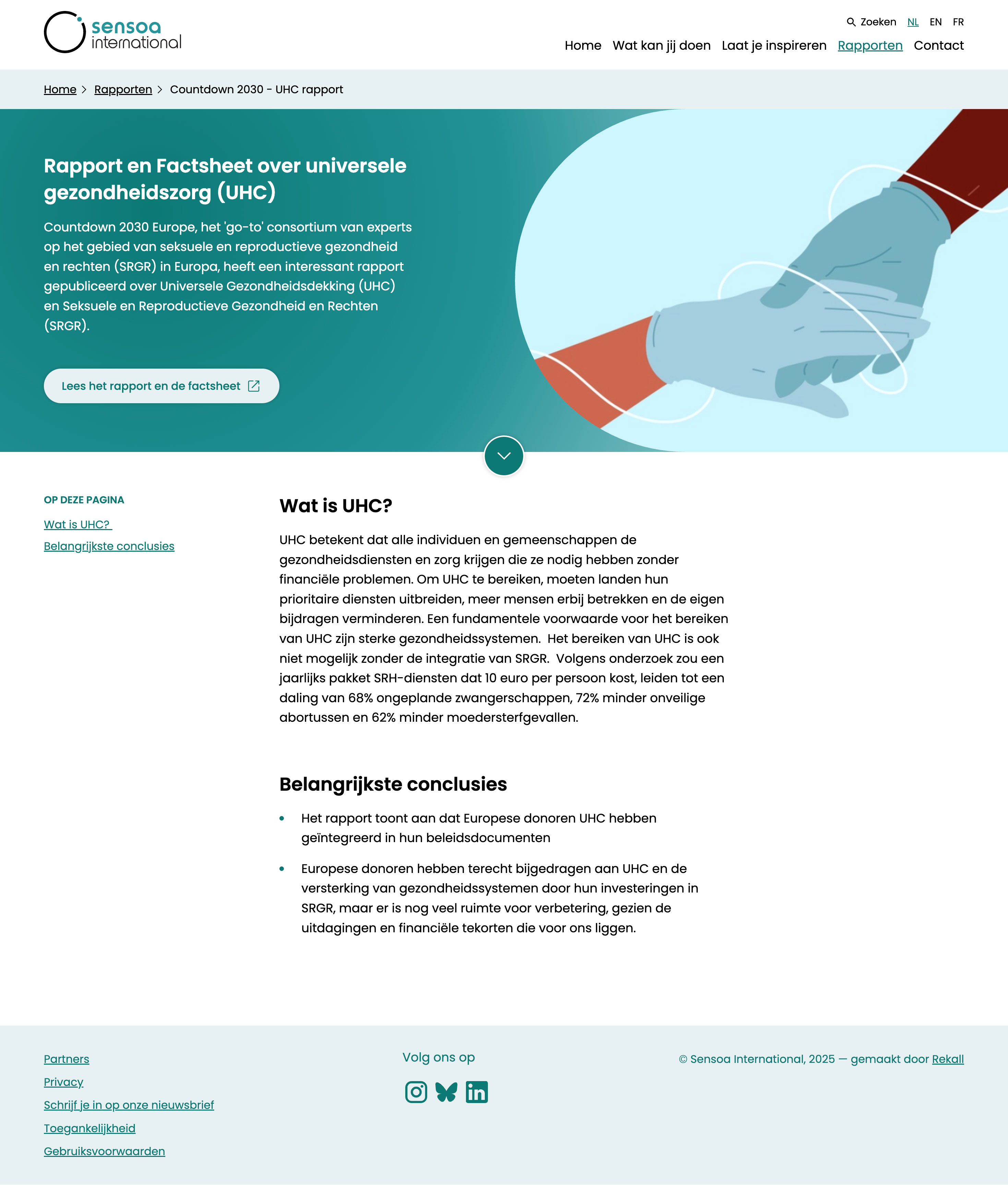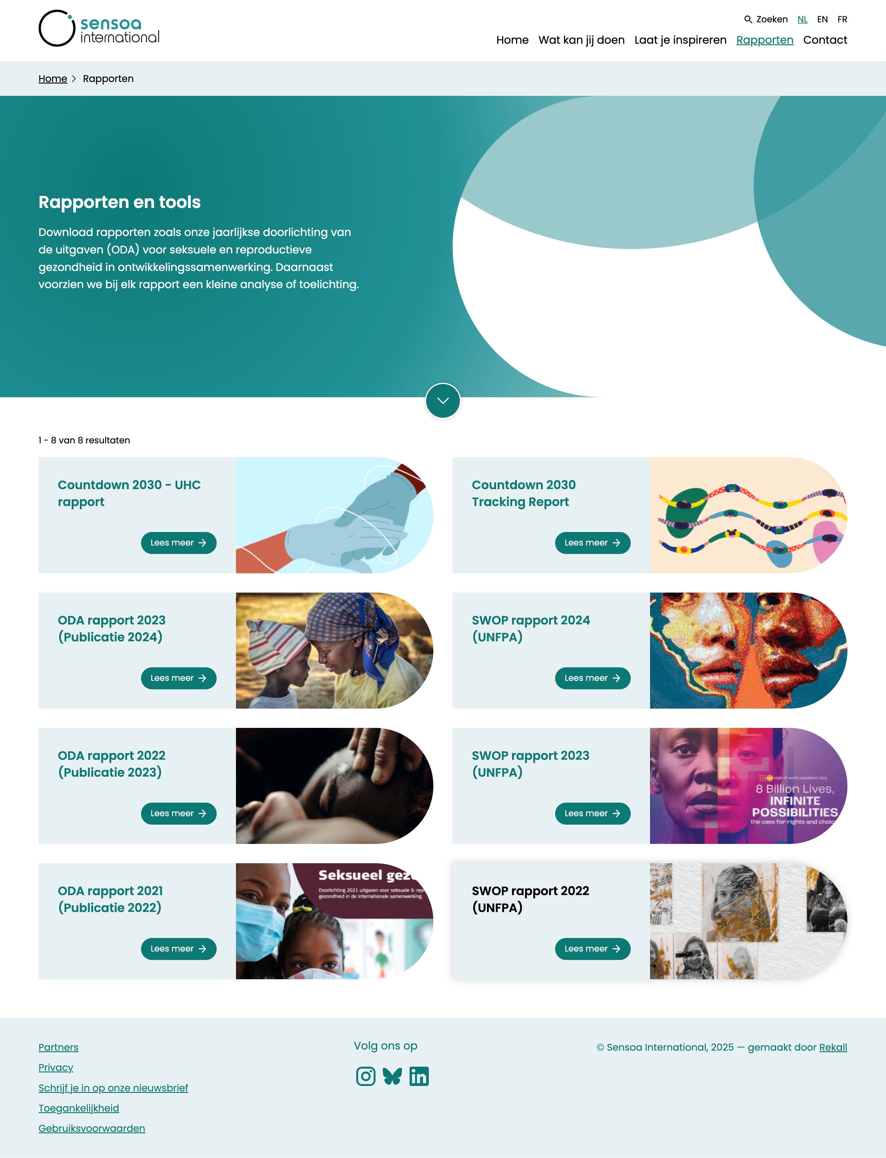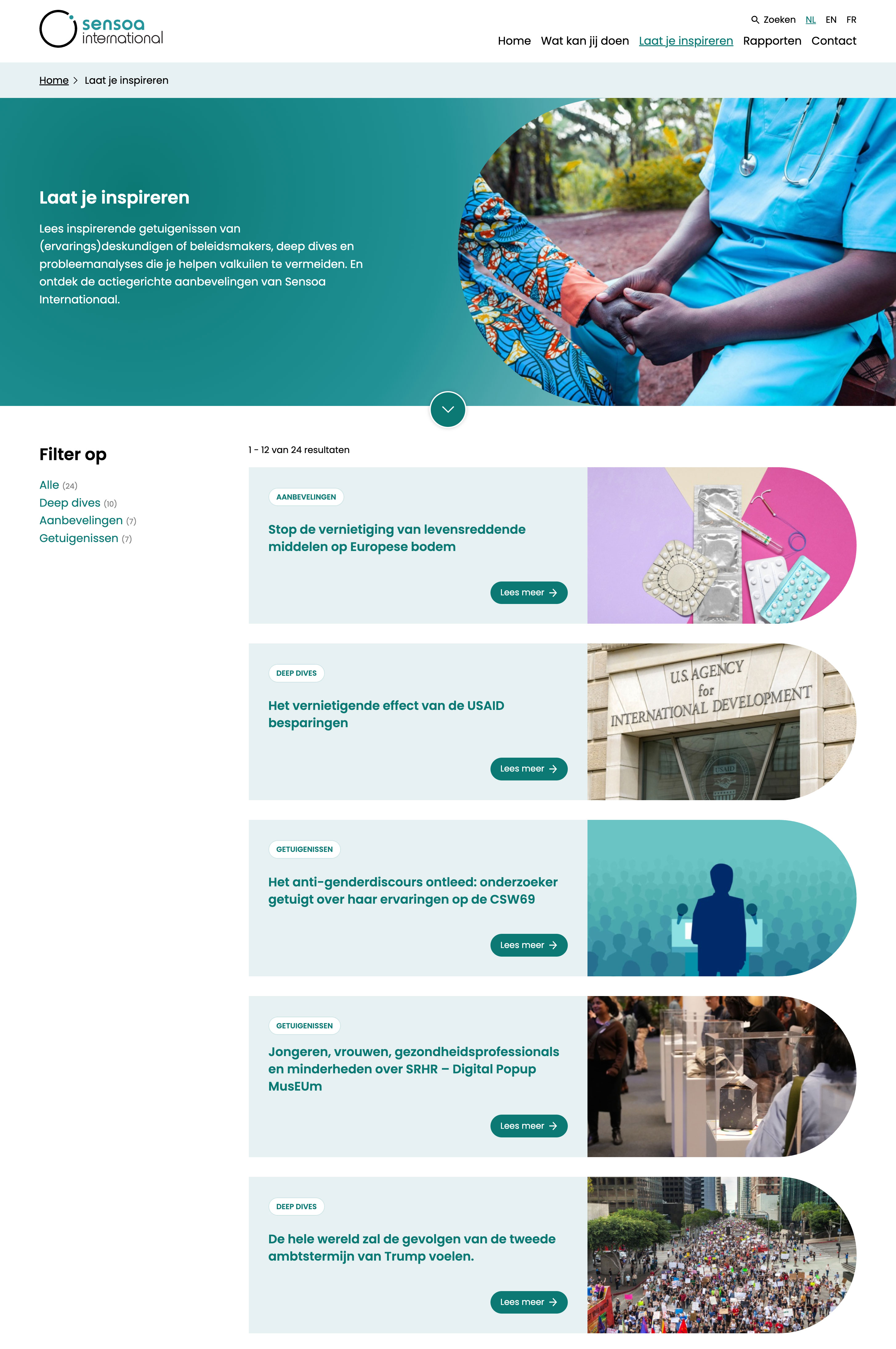 De site biedt een overzichtelijke databank met inspiraties en rapporten over internationale beleidsvragen. Samen met Sensoa werkten we aan de structuur van de site om het aanbod voor de gebruiker snel zichtbaar te maken en meer betrokkenheidsgevoel te creëren: beleidsmedewerkers inspireren om actief mee te doen en duidelijke stappen aanbieden om gezondheid en rechten wereldwijd te versterken.