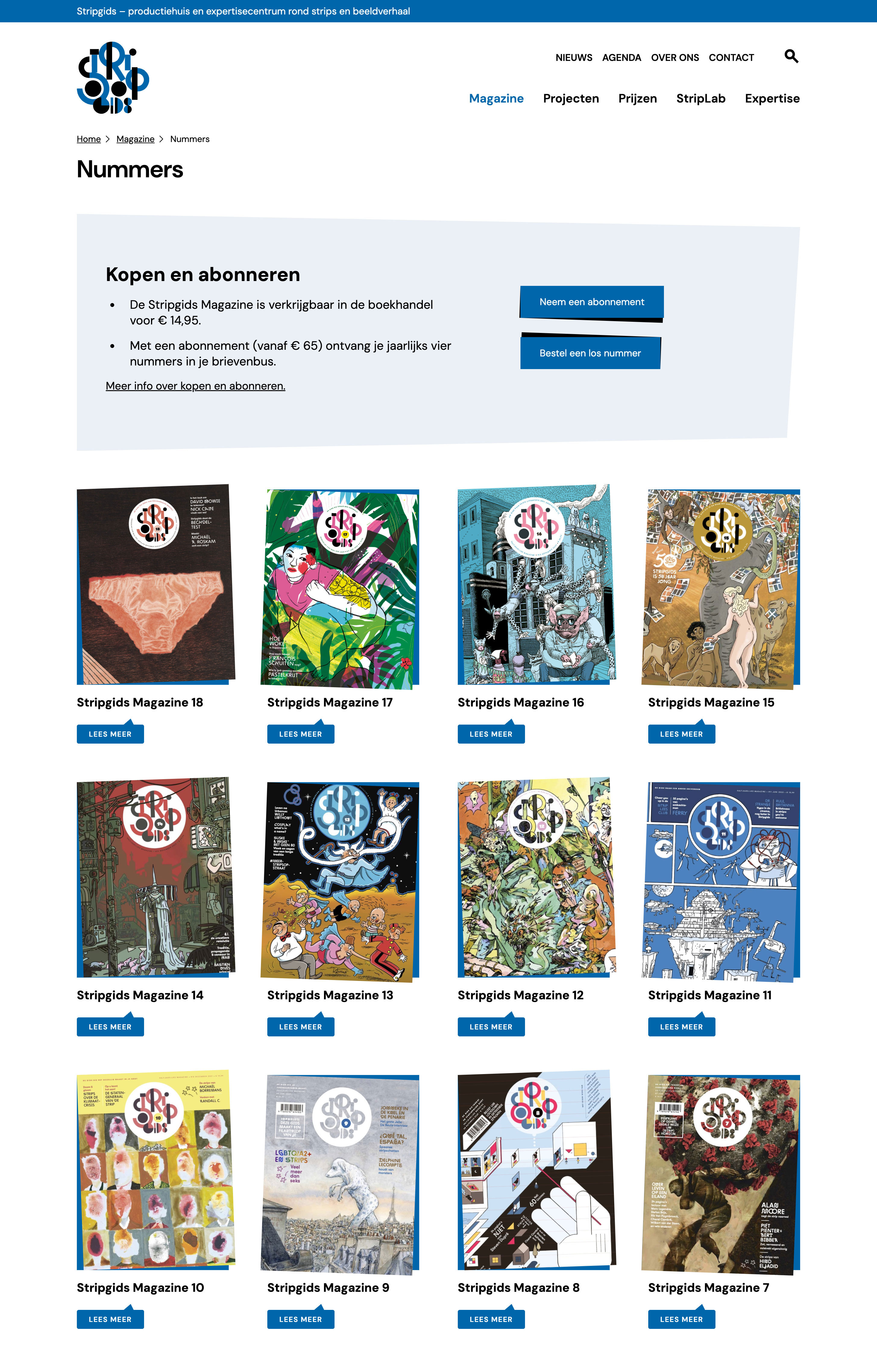 We hebben de rijke inhoud van Stripgids zo veelzijdig mogelijk weergegeven. Pagina’s kunnen flexibel opgebouwd worden met verschillende blokken, zodat interviews, essays en recenties, evenementen en nieuws elk op hun eigen manier gepresenteerd kunnen worden.